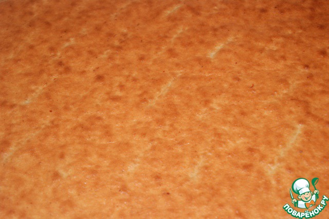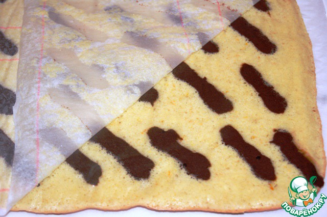 Готовый бисквит перевернуть на чистый лист пекарской бумаги и снять лист, на котором он выпекался.