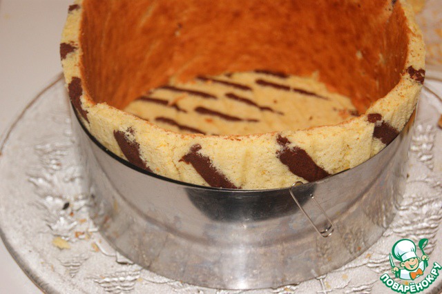 Из одного бисквита вырезать круг диаметром 22 см и поместить его на дно формы рисунком вниз. Я ошиблась, а вы будьте внимательны! -