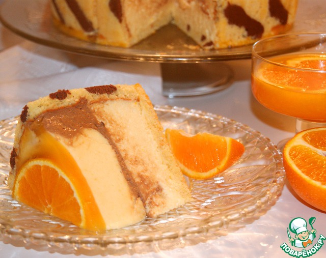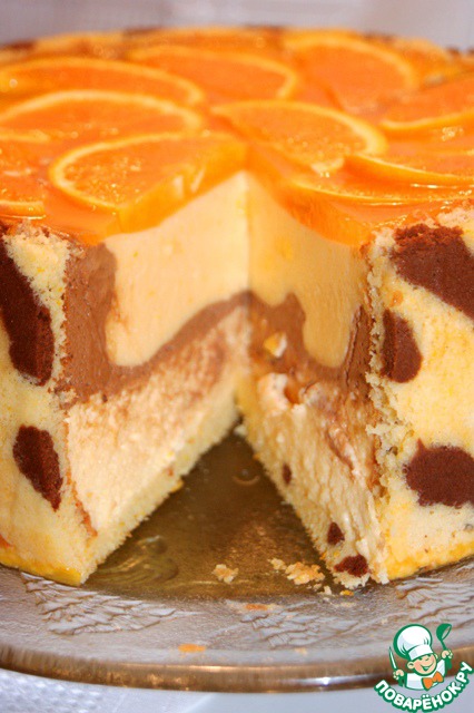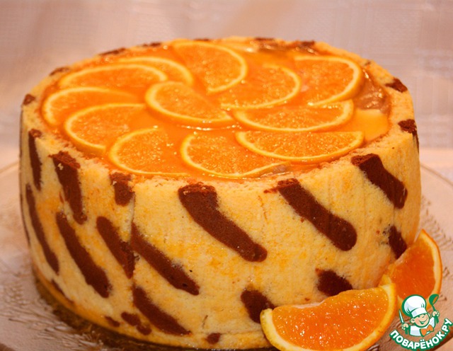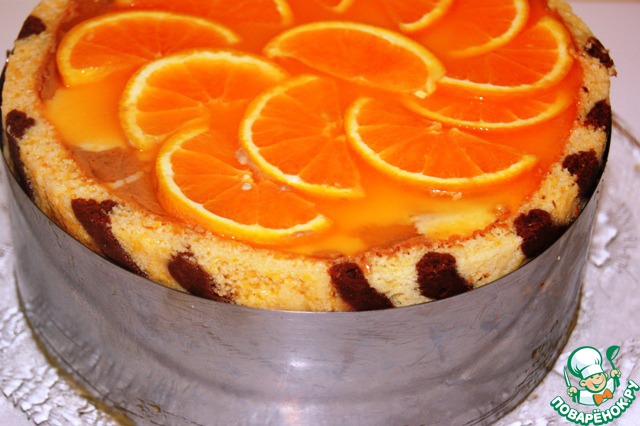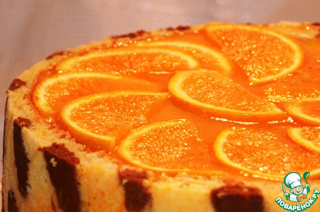 Апельсин нарезать тонкими дольками и выложить сверху торта. Залить остывшим апельсиновым желе.. -
