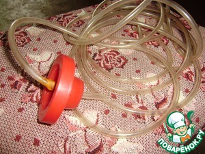При брожении в нашем сосуде будут образовываться газы, которые необходимо выпускать. Но тут есть одно ограничение: в нашу бутыль не должен попасть воздух. Для этого трубку вставим в проделанную в пробке дырку. Трубочку нужно вставлять не сильно глубоко, почти к самому краю пробки (чтобы образовавшиеся газы смогли выходить через нее), не касаясь сока винограда. Место соединения трубки и пробки необходимо герметизировать (можно использовать детский пластилин или воск). Второй конец трубки опускаем в банку с водой, так, чтобы он был погружен в воду. В результате газы будут выходить через трубку, но при этом кислород не будет попадать в нашу бутыль. Оставляем на 3 недели. -
