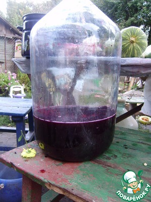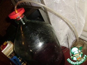 Сусло переливаем в винный бутыль (на этом этапе можно в любой посуде оставить). На каждый литр сусла добавляем 30 г сахара и закрываем крышкой (при этом снимаем пробочку, чтоб было поступление воздуха) или марлей. Оставляем на 5 дней бродить в теплом месте.