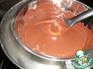 300 г горького шоколада (50%) порубить и растопить на водяной бане (вода не должна касаться дна посуды, где будет топиться шоколад).