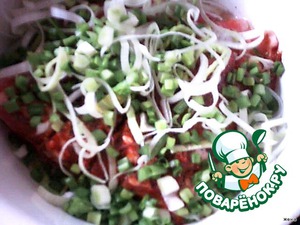 Зелень шинкуем полосками, и укладываем на мясо. Луковицу - кольцами и туда же. Сбрызнем наше творение маслом и и ставим в холодильник на 2 -3 часа мариноваться периодически помешивая.