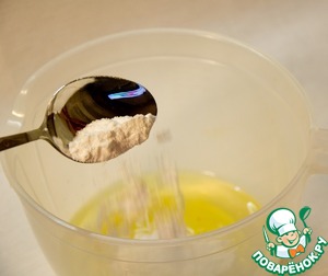 Включаем духовой шкаф разогреваться до 200 град. и продолжаем. Аккуратно вводим желтки в белки. Затем, также аккуратно, вводим муку.