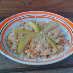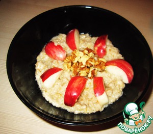 • Нарезать яблоки, добавить в кашу мёд, орехи, яблоки по вкусу.