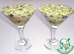 Салат я подавала в бокалах. Салат выложить слоями в такой последовательности: капуста, черника, капуста, грецкие орехи, капуста, черника и т. д., пока не заполнятся бокалы.