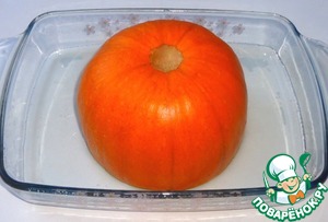 В форму для запекания налить воду, положить тыкву срезом вниз и выпекать в духовке при температуре 200-220 градусов в течение 25 - 30 минут. Тыква должна стать мягкой, но при этом сохранить форму.