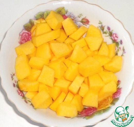 1/3 часть срезанной тыквы очистить от семян и кожицы и нарезать на не очень крупные кусочки.