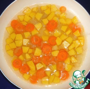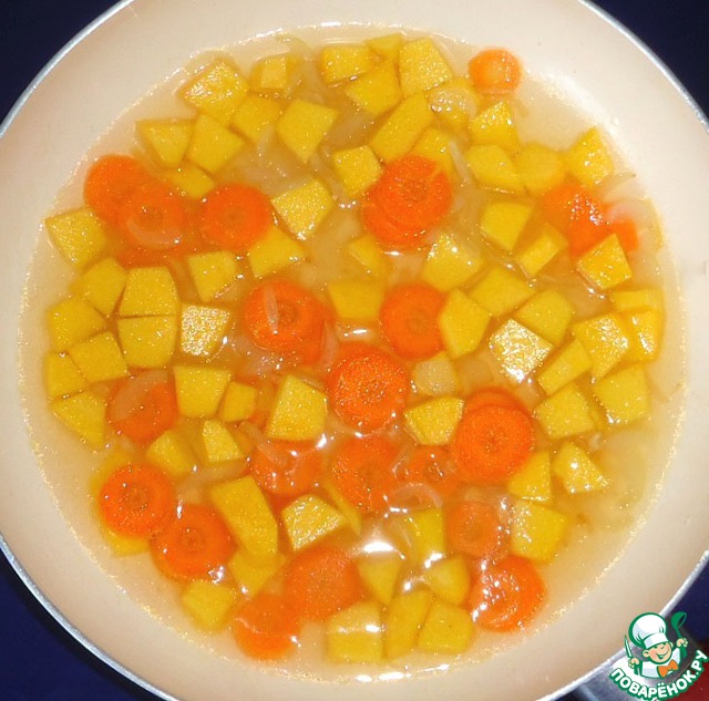 Морковь нарезать тонкими кружочками и добавить вместе с тыквой к луку, залить водой, накрыть крышкой, довести до кипения и тушить на медленном огне до мягкости тыквы и моркови.