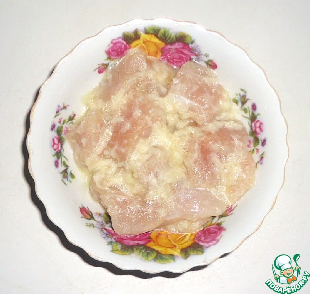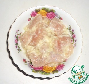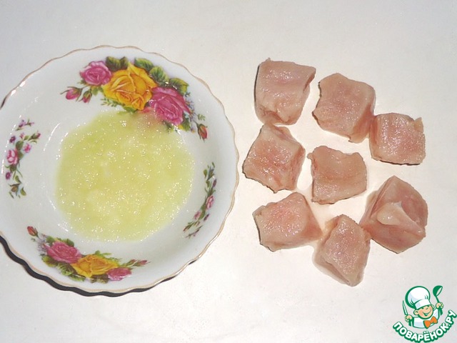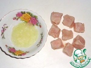 Куриное филе нарезать на кубики. Лук очистить, натереть на самой мелкой тёрке.