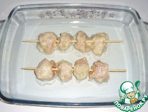 Куриное филе в луковом кляре нанизываем на шпажки, предварительно смоченные в воде, выкладываем в форму и запекаем в разогретой духовке до 180-200 градусов 20-25 минут.