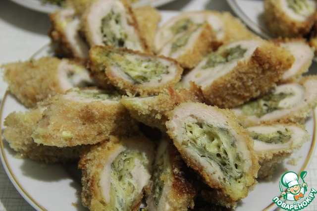Куриные рулетики с начинкой из сыра и зелени выложить в форму для запекания и выпекать в духовке, разогретой до 180 -190 градусов, 20-25 минут.