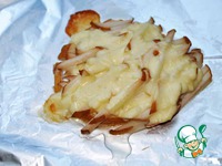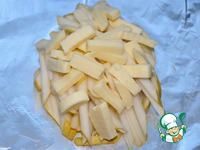 Берём противень, застилаем фольгою, горкой выкладываем нарезанные груши и сверху на них нарезанную моцареллу.