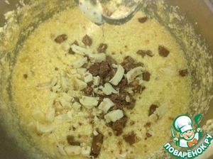 Ножом мелко режем белый и темный шоколад, добавляем в тесто и взбиваем