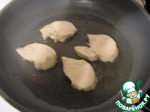 Куриную грудку нарезать пластиками поперек волокон, чуть залить водой и потушить на сковороде с антипригарным покрытием 10 минут