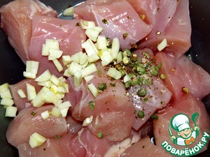 добавляем кусочки курицы и обжариваем на сильном огне со всех сторон.
