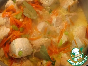 Добавляем вино со сливками, соль и перец по вкусу, лавровый лист.