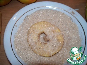 Дальше обмакнуть кружочек яблока с двух сторон в сахар с корицей. -