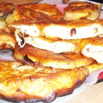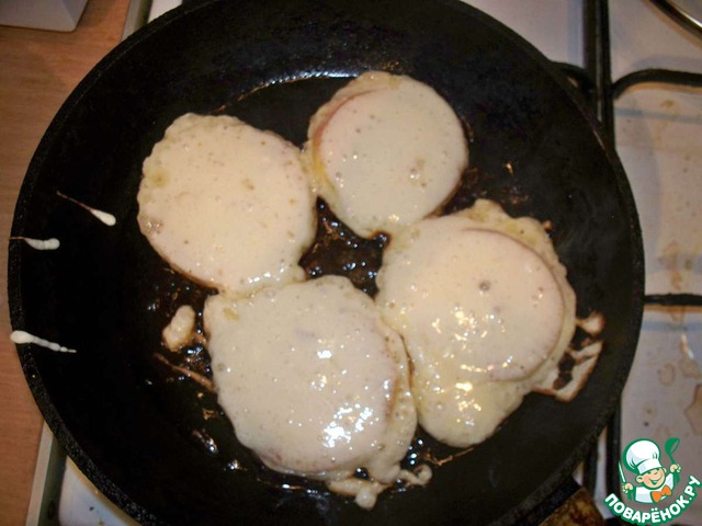 Затем окунуть ломтик яблочка в тесто, хорошенько, чтоб полностью был в нем, потом если будет лишнее, стряхнуть и быстро на сковородку.
