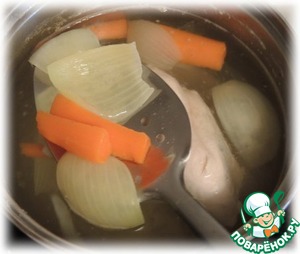 Когда бульон сварился, шумовкой достаем грудку и овощи.