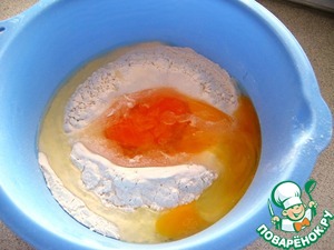 Муку всыпать в миску, сделать углубление, добавить соль, яйца, дрожжи. Тщательно перемешать. Затем добавить 2/3 размягченного масла и сахар.