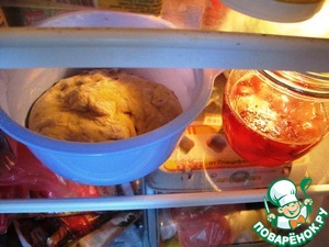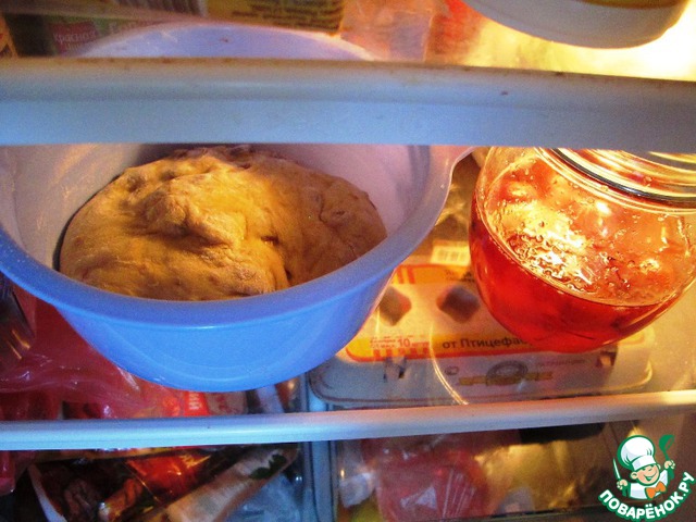 Через час, когда поднимется, снова перемешать, накрыть полотенцем и на 5 часов убрать в холодильник.