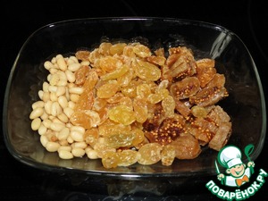 Сухофрукты вымыть, замочить минут на 20 в чае с бергамотом, затем нашинковать и перемешать, добавить кедровые орехи.