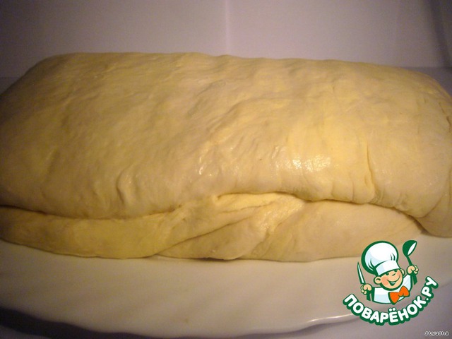 Достаем из холодильника. Тесто должно подняться. Раскатываем в одну сторону. Складываем втрое и опять убираем в холодильник уже на 20 минут. Процедуру повторяем 4 раза.
