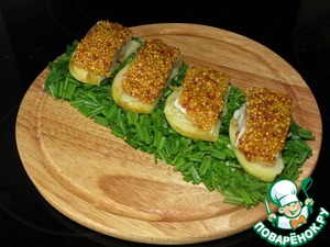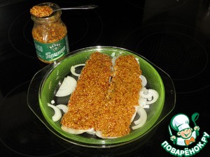 Затем сельдь обмазать французской горчицей, закрывая ею всю поверхность филе.