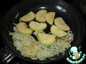 Яблоки нарезать полукруглыми дольками. Репчатый лук очистить, нарезать полукольцами, лук обжарить в растительном масле, затем добавить дольки яблок на 1-2 минутки.