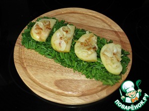 Зеленый лук мелко нарезать, выложить на доску или блюдо. Замаринованное филе нарезать на кусочки по размеру яблочных долек. На каждую дольку яблока положить немного обжаренного лука.