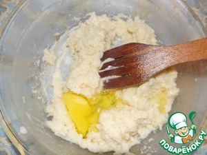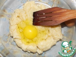Тесто остыло и начинаем по 1 яйцу вмешивать в тесто. Сначала вмешиваем 1 яйцо...