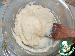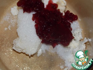 Затем приступаем к приготовлению начинки. Творог смешиваем с 5 чайными ложками сахара, сметаной и клюквенным соусом.