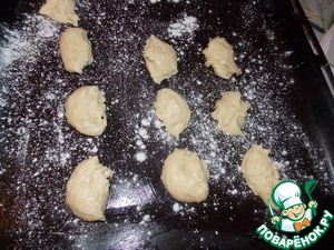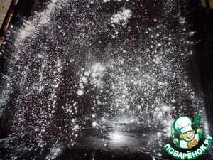 Пока тесто остывает, разогреваем духовку до 200-250 град. (соответственно зависит от вашей духовки). И подготавливаем противень: смазываем его небольшим количеством сливочного масла и присыпаем немного мукой.