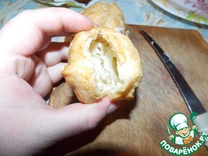 Затем надрезаем эклер и аккуратно ложечкой начиняем (можно шприцом, так проще).