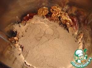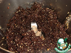 Сложить в комбайн очищенные от косточек финики, промытый и обсушенный изюм, грецкие орехи, кэроб в порошке и мед.
