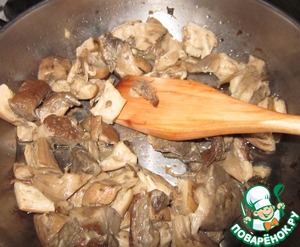 Складываем все обжаренные овощи и грибы в кастрюлю с толстым дном, солим, перчим и тушим на маленьком огне 10-15 минут.