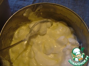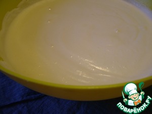 Сначала нужно приготовить меренгу. Для этого из воды и сахара сварить сироп "до толстой нитки". Взбить белки до крепкой пены, не останавливая взбивание, сразу влить кипящий сироп в белки. Продолжать взбивать до полного остывания. -