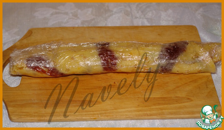По прошествии этого времени даем немного остыть и в теплом виде сворачиваем наш сыр рулетиком, заворачиваем в пищевую пленку и отправляем в холодильник часа на два, а лучше больше. За это время сыр остынет и уплотнится, так его удобно будет нарезать и подавать.