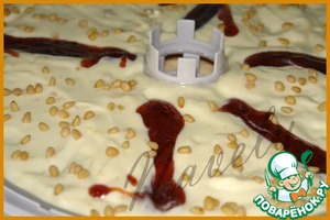 Далее посыпаем кедровыми орешками, немного их как бы вдавливаем в йогурт. Орехи могут быть какие угодно, крупные нужно порубить до мелких кусочков.