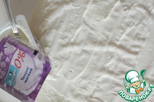 Нам понадобится 1 пласт теста фило или очень, очень тонко раскатанное бездрожжевое тесто - чем тоньше, тем лучше. Аккуратно наносим на тесто мягкий творог 0% жирности.