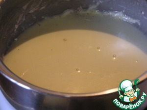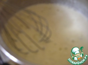 • Тонкй струйкой в кипящие сливки, не переставая помешивать венчиком, влить желтковую смесь, варить на медленном огне, взбивая постоянно венчиком до загустения