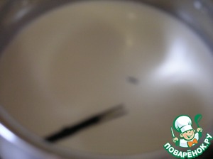 • Половину палочки ванили разрезать вдоль, вычистить семена и опустить в сливки 10% жирности. Довести до кипения