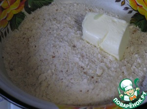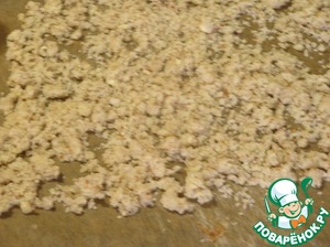 • Перетереть в крошку руками, выложить на пергамент равномерным слоем и выпекать 10 минут при температуре 200 градусов