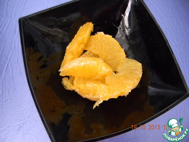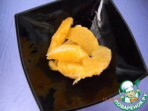 Апельсины очистить от кожуры, разделить на дольки, снять с долек пленку. Часть долек можно разрезать на несколько частей.