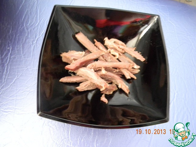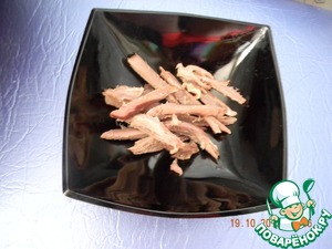 Отвариваем мясо или же обжариваем и режем кусочками.