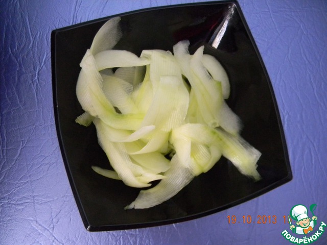 Огурцы помыть, отрезать кончики и нарезать вдоль плода пластинками толщиной примерно 1 мм.