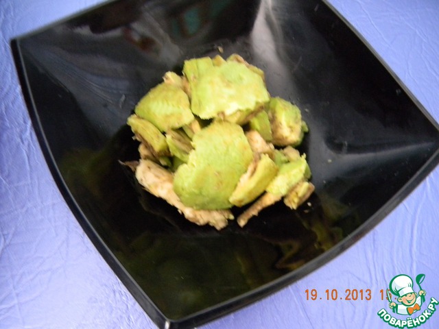 Авокадо разрезать пополам, убрать косточку. Чайной ложкой отламывать небольшие округлые кусочки, можно нарезать на кусочки.
