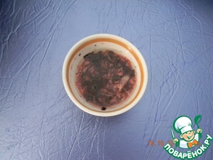 Делаем заправку. Смешиваем чеснок и соль, растираем их пестиком. Затем добавляем фиолетовый базилик и продолжаем растирать, чтобы ингредиенты хорошо перетёрлись и пропитались ароматами друг друга. Затем добавляем масло и соевый соус, перемешиваем.