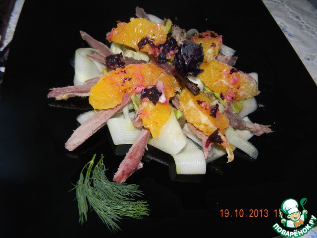 Первым слоем накладываем пластинки огурца, затем авокадо, кусочки мяса и апельсин и сверху поливаем заправкой...